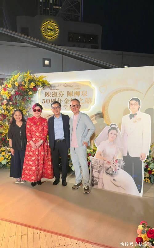 十月一号天一黑,维港的烟花就炸开了,临海酒店这边特别热闹,陈淑芬跟她先生陈柳泉办金婚宴,张国荣以前的经纪人,香港圈子里的大姐大,五十年的婚姻,这个场面肯定小不了,酒店门口先是一面花墙,墙上挂着他们1975年结婚的老照片,男的帅女的美,那股子青春劲儿直接扑脸上。